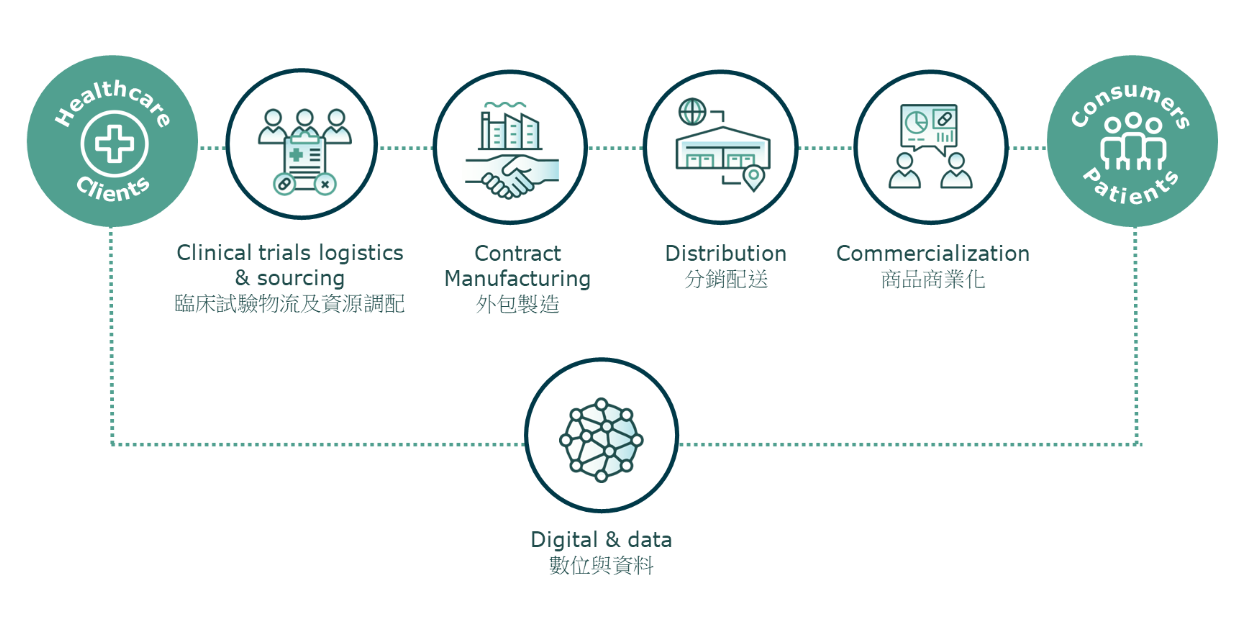 裕利醫藥集團的解決方案包含臨床試驗倉儲物流事業、醫藥商業行銷事業、末端通路、醫藥及病患服務事業以及數據分析服務。